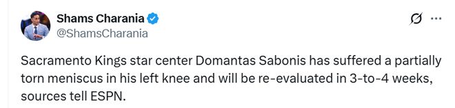 本赛季首个月,萨博尼斯伤病缠身麻烦不断。季前赛期间他因腿筋拉伤错过了球队的赛季揭幕战,本月早些时候又因肋骨不适缺席了两场比赛。如今受困于这次半月板撕裂,他还将至少缺席接下来的10场赛事。
